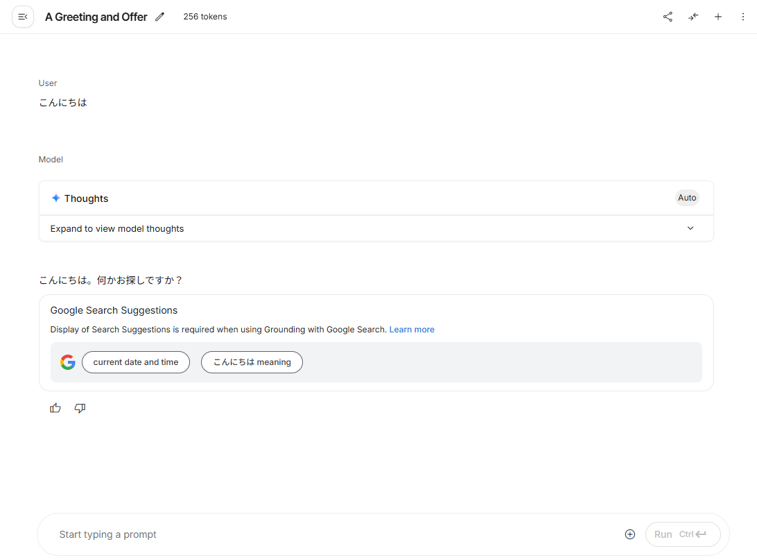 少し待つと、応答エリアにAIからの返事が表示されます。「私はGoogleによってトレーニングされた、大規模言語モデルです。」といった内容の自己紹介が返ってきたでしょうか?
