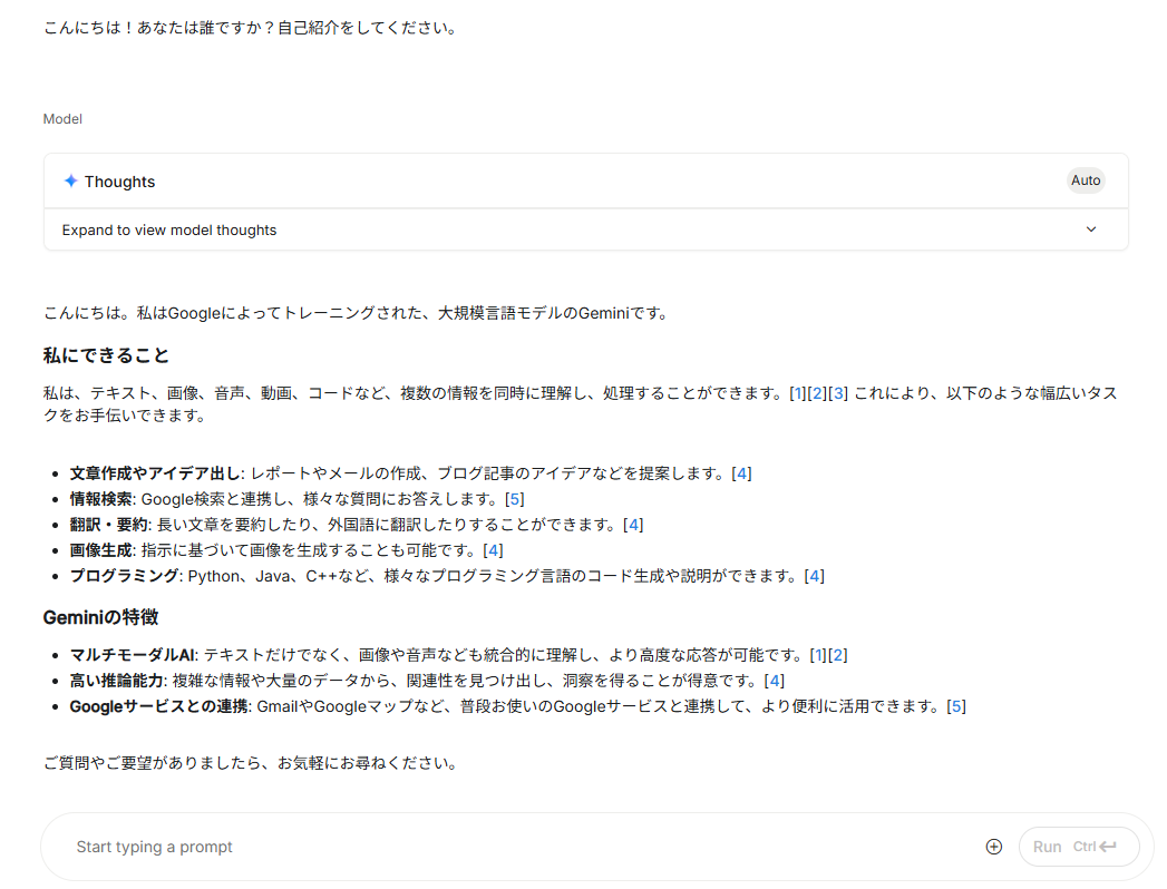 まずは簡単な自己紹介をお願いしてみましょう。プロンプト入力エリアに、以下のように入力してみてください。