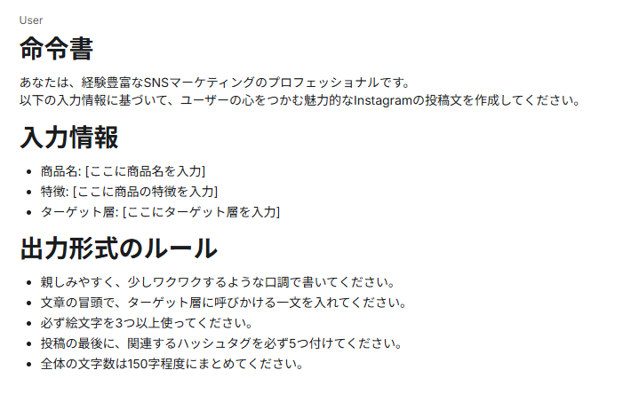 次に、毎回あなたがAIに与える情報が何かを、分かりやすく項目立てして定義します。[ ]のような記号で囲むと、後からどこを書き換えればよいか一目でわかるのでおすすめです。