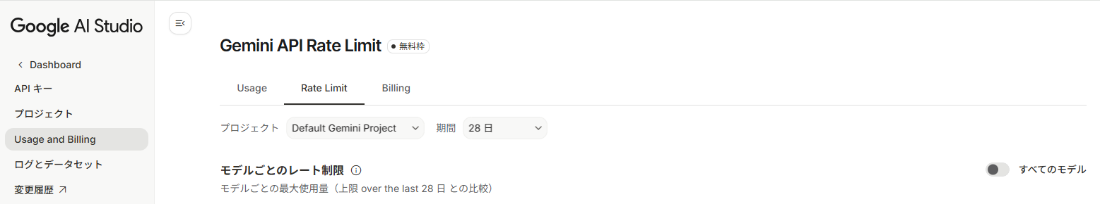 - 無料利用枠の「クォータ」は、「Usage and Billing」の「Rate Limit」タブで確認できること。