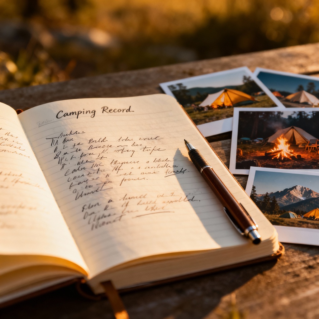 写真やSNS投稿に加えて、「記録ノート」をつけると、次回のキャンプに役立つ貴重な情報が残せます。