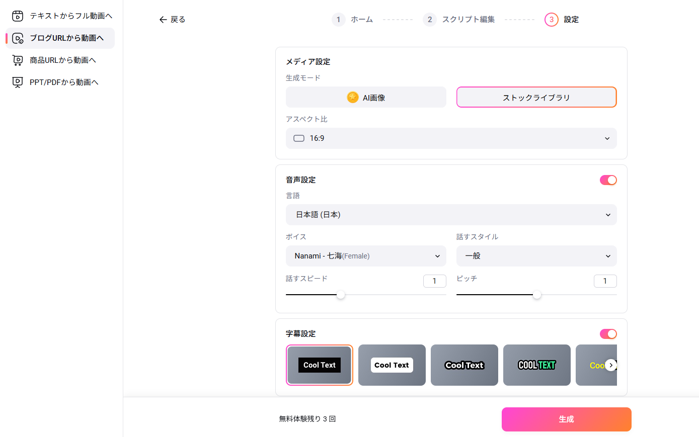 ここに、試しに以前書いたブログ記事のURLを貼り付け、「生成」ボタンを押してみました。字幕のスタイルなどを選べますが、今回はデフォルトのまま進めます。