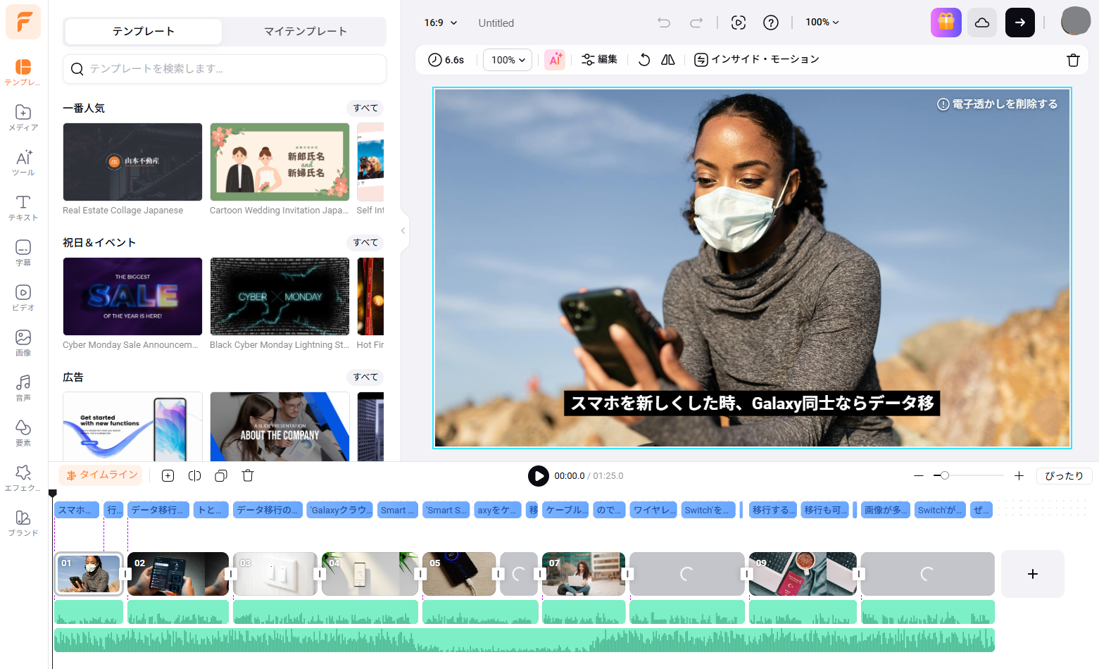 解析が終わると、自動的に編集画面に切り替わります。そして、そこには驚きの光景が…!僕のブログ記事が見出しごとにシーン分けされ、要約されたテキストが字幕として配置し、それぞれの内容に合った動画素材まで自動で設定されているではありませんか!