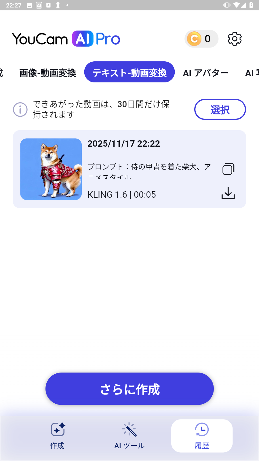 - 複雑な指示は通じにくい:「柴犬が甲冑を着て、京都の街を走り抜ける」のように、複雑な背景や動きを指示すると、意図とは違うものが出来上がることがありました。シンプルなプロンプトの方が成功しやすい印象です。